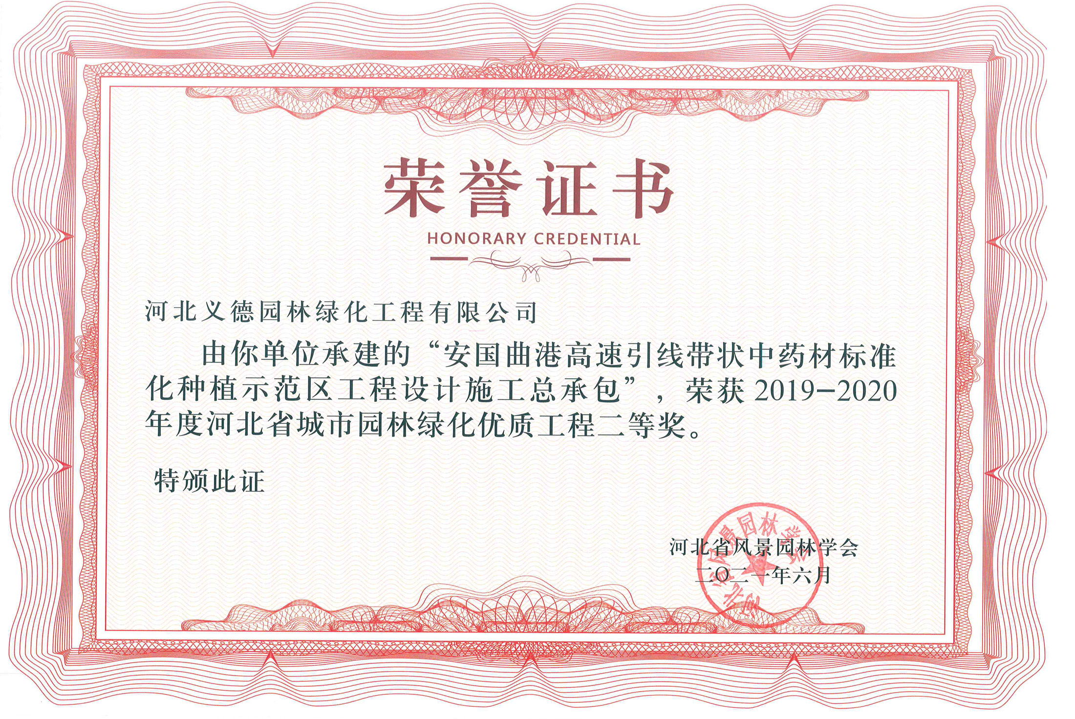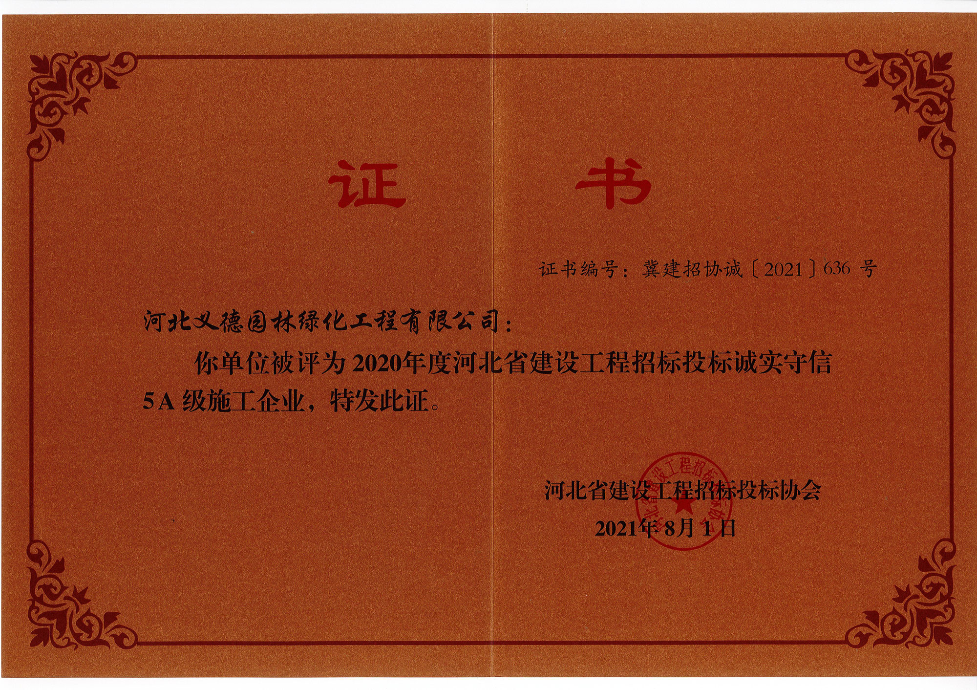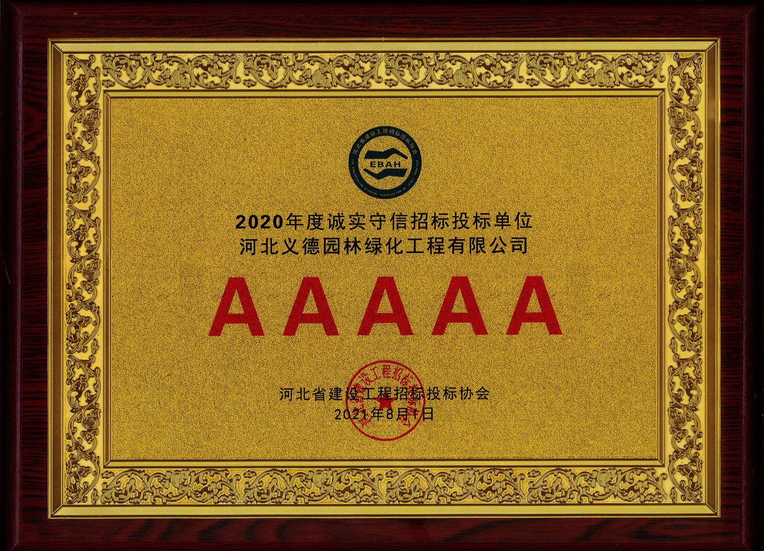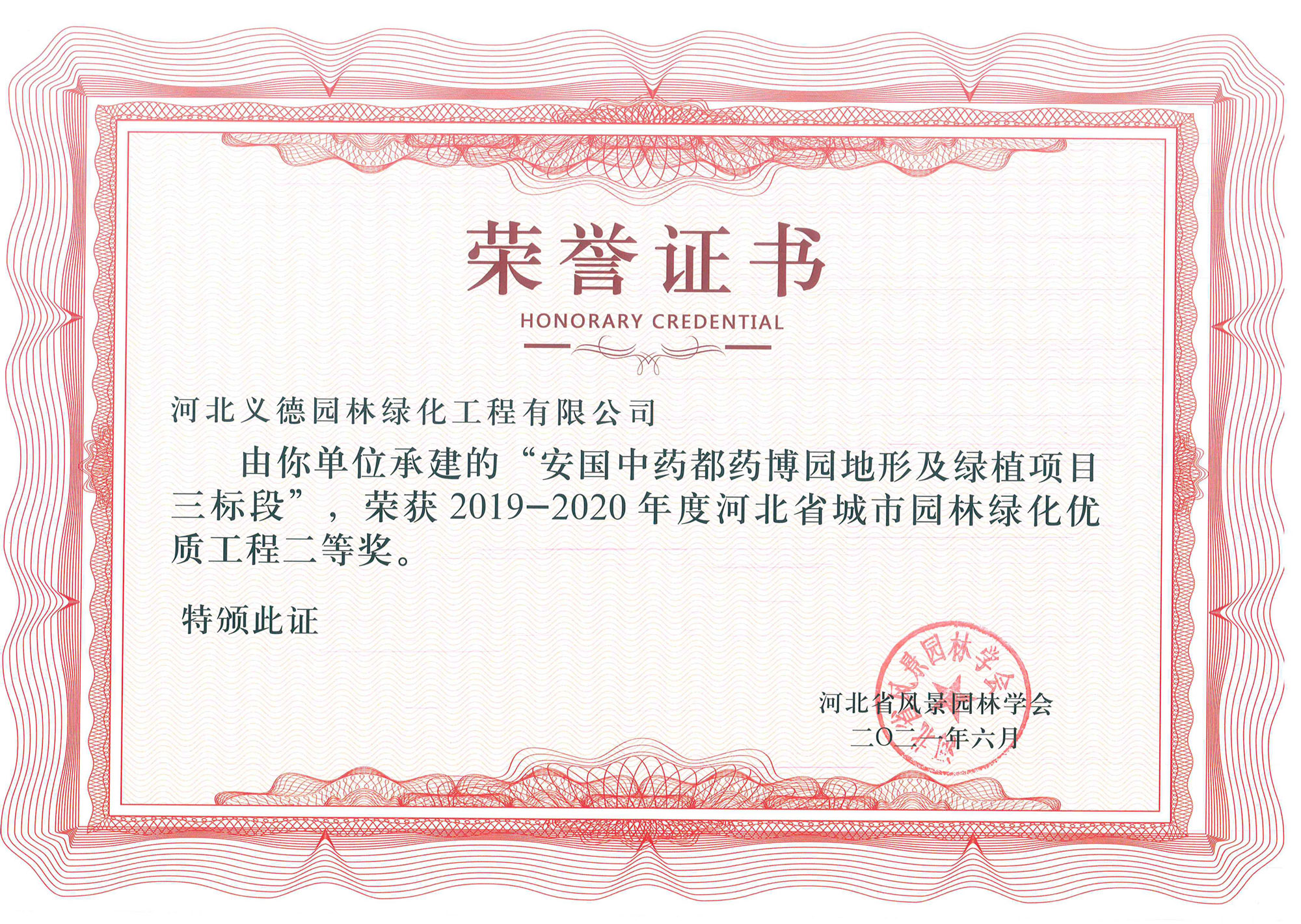 近幾年來(lái)我公司被授予2019年-2022年河北省扶貧龍頭企業(yè)、2018年國(guó)家林業(yè)標(biāo)準(zhǔn)化示范企業(yè)、2019年度全國(guó)苗圃50強(qiáng)、2018-2019年度河北省林業(yè)重點(diǎn)龍頭企業(yè)、2018年保定市精品特色現(xiàn)代農(nóng)業(yè)園區(qū)、2018年度保定林木種苗協(xié)會(huì)授予特色苗圃、2018年度北方十佳特色苗圃、2016-2019年河北省建設(shè)工程招標(biāo)投標(biāo)誠(chéng)實(shí)守信5A級(jí)施工企業(yè)等榮譽(yù)稱號(hào),2017年保定市林木種苗龍頭企業(yè)、石家莊市2017年度優(yōu)秀園林企業(yè)。